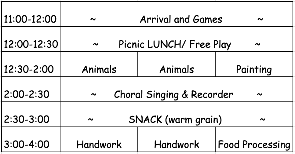 Earthsong finds that offering three activity days in a row provides a healthy rhythm for the growing child to sink into as well as an ample amount of flexible, homeschooling family time - for academics and other adventures!